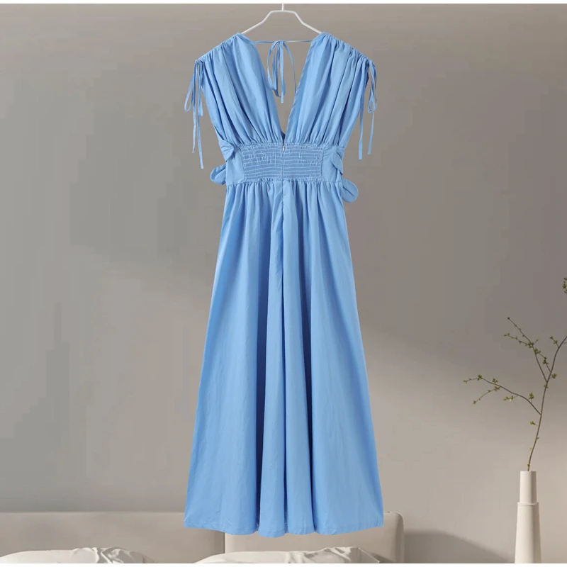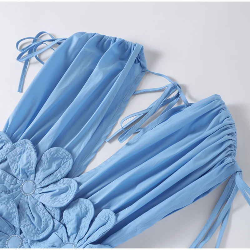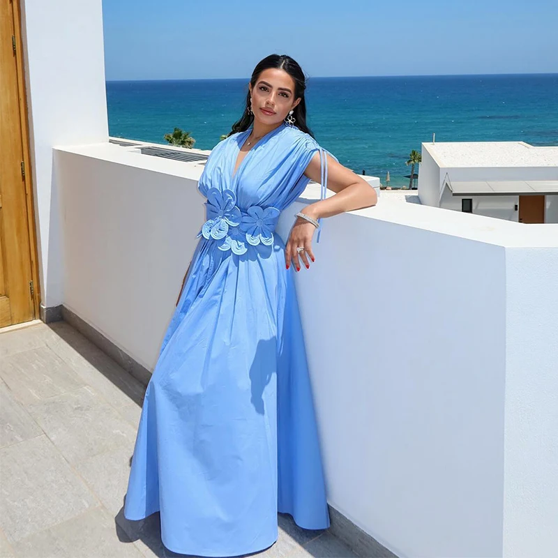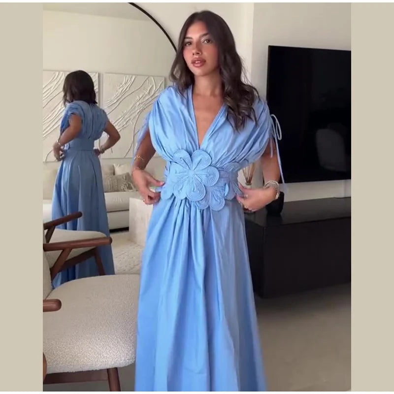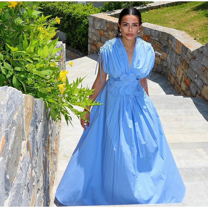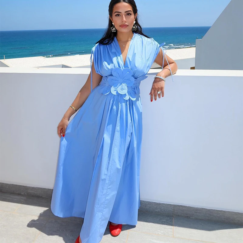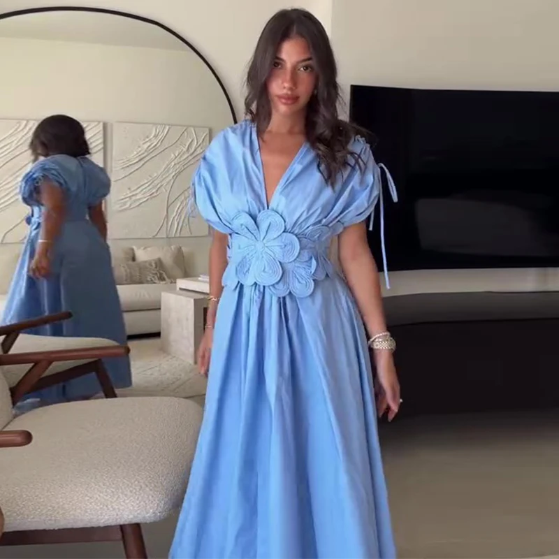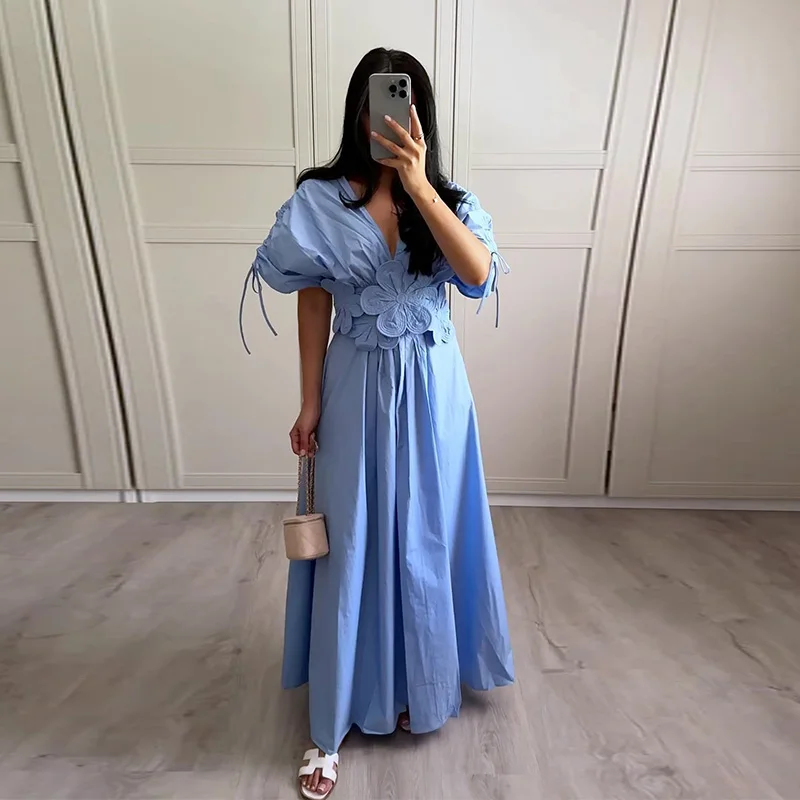 Elegant 3D Flower Solid Pleated Long Dress Women Chic V Neck Short Sleeved Drawstring Lace Up Robes Summer Lady Fashion Dresses