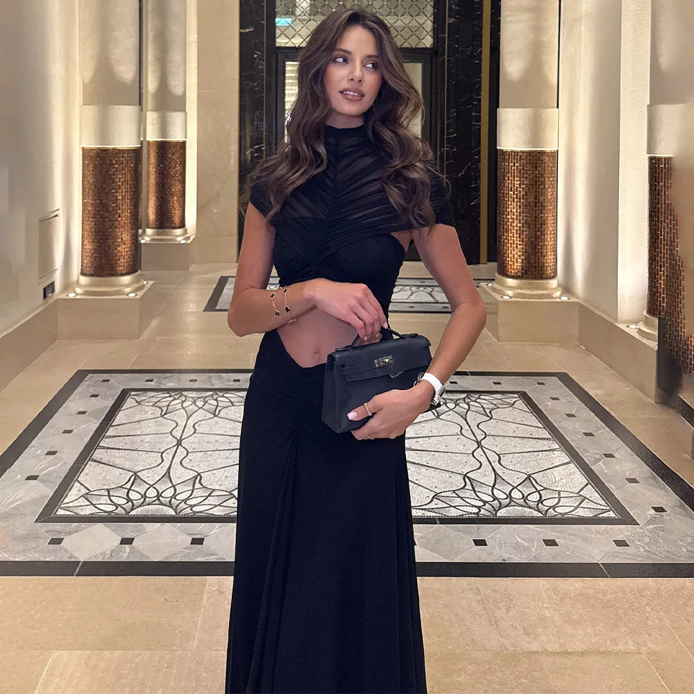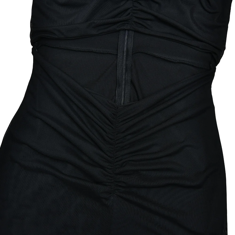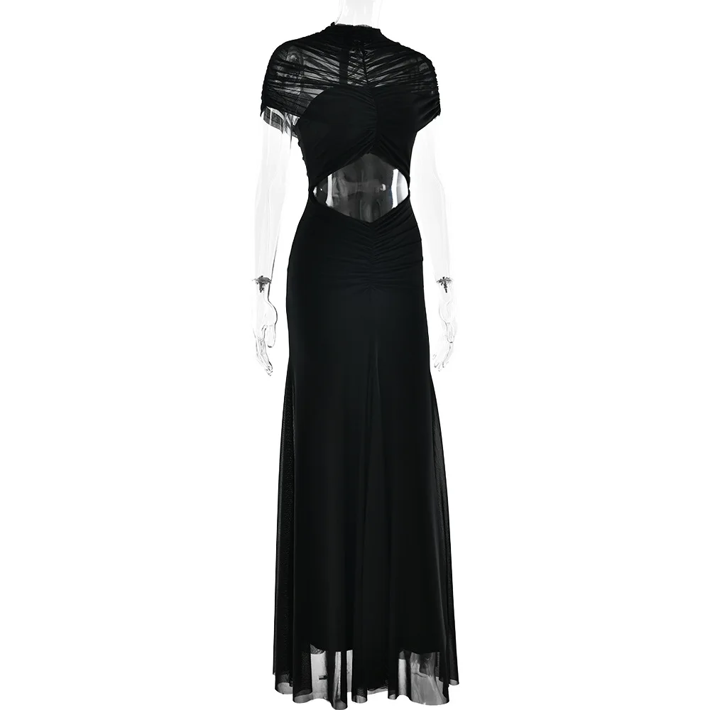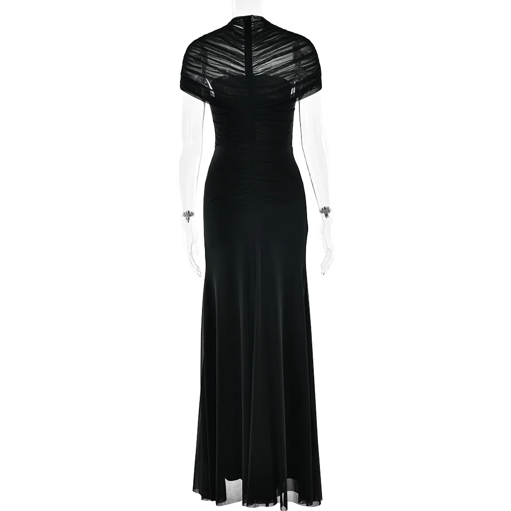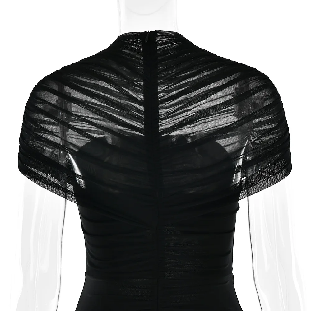 New Ruched Irregular Mesh Dress Women Patchwork High Neck Short Sleeve Hollow Out Long Dresses Female Party Maxi Dresses Outfits