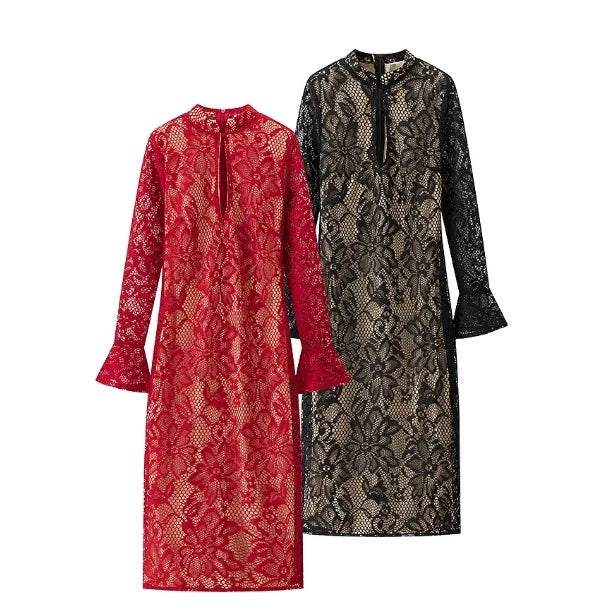 Suninheart Winter Women's Clothing 2024 Black Lace Bodycon Party Dresses Flare Sleeve Elegant Midi Dress for Special Events