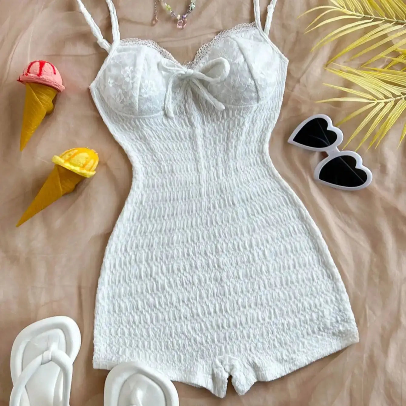 2025 New sexy Spice bodysuit solid color lace edge bow halter jumpsuit bag hip shorts women's swimsuit