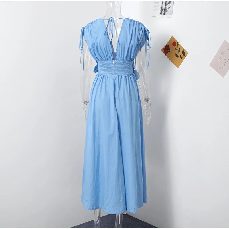 Elegant 3D Flower Solid Pleated Long Dress Women Chic V Neck Short Sleeved Drawstring Lace Up Robes Summer Lady Fashion Dresses