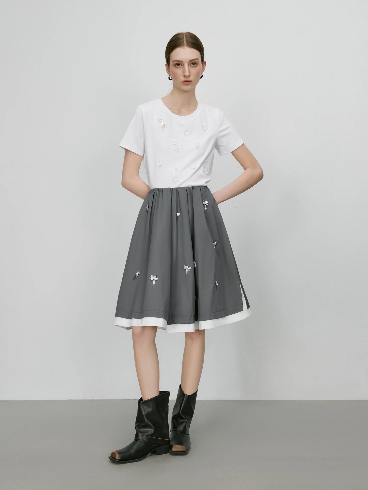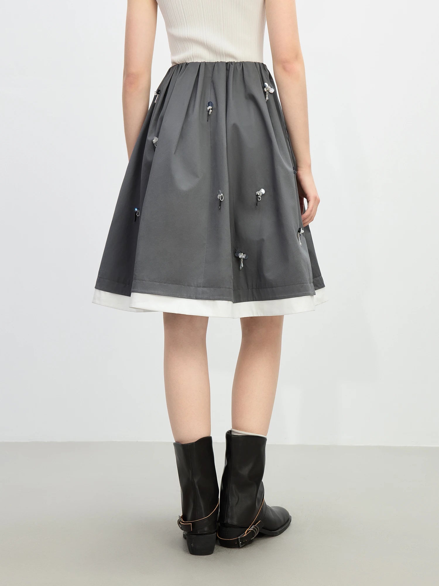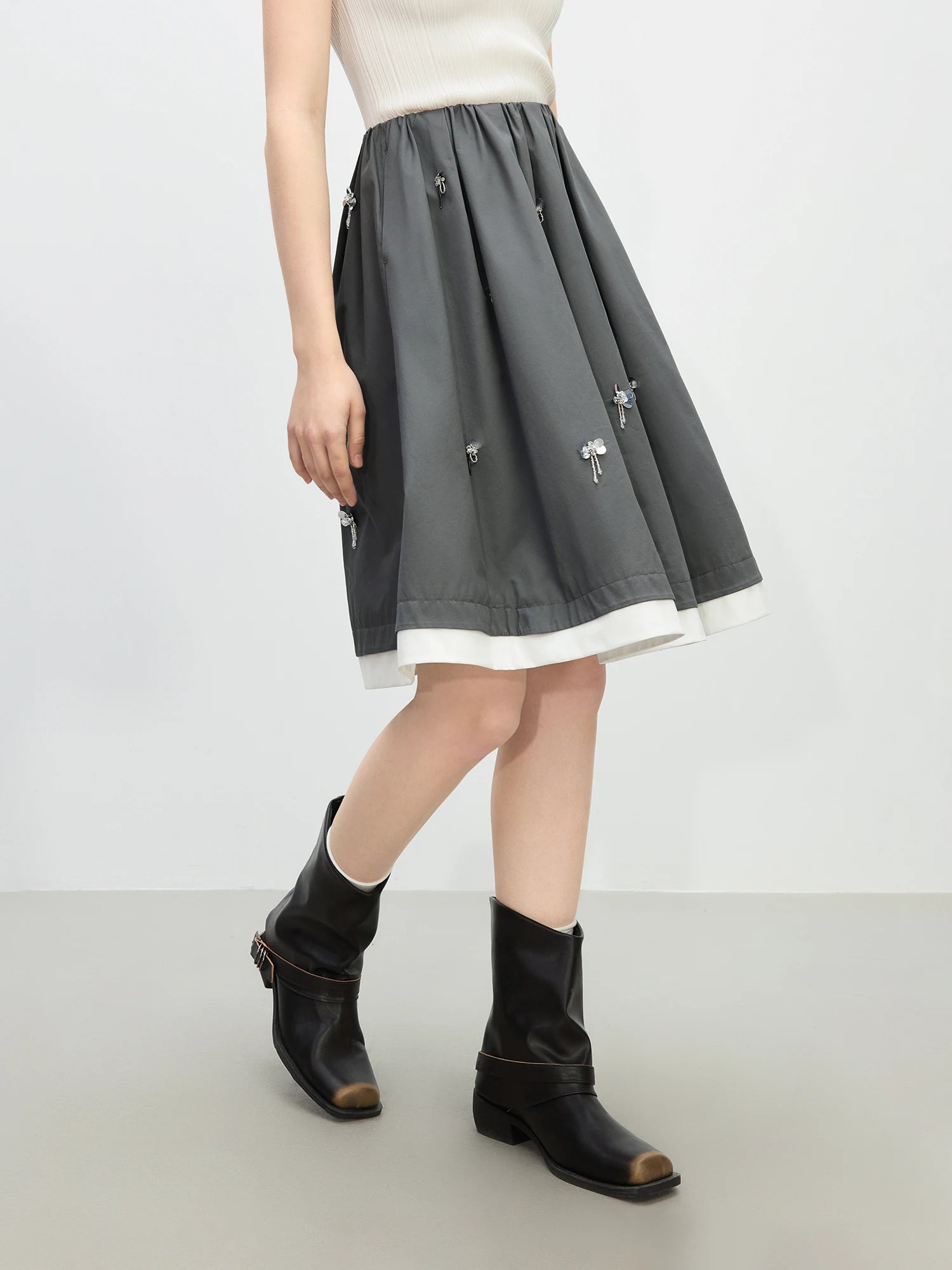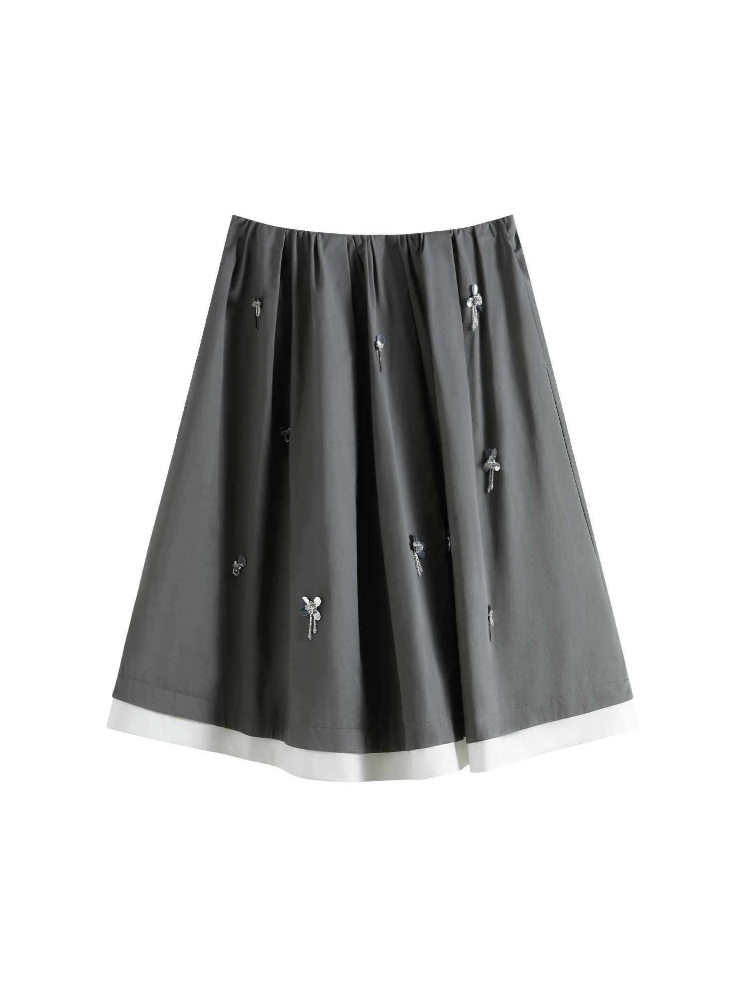 FSLE【Premium Series】Contrast Color Stitching Beading Design Women Skirts Grey White Patchwork Female 2025 Summer Skirt 25FE12005